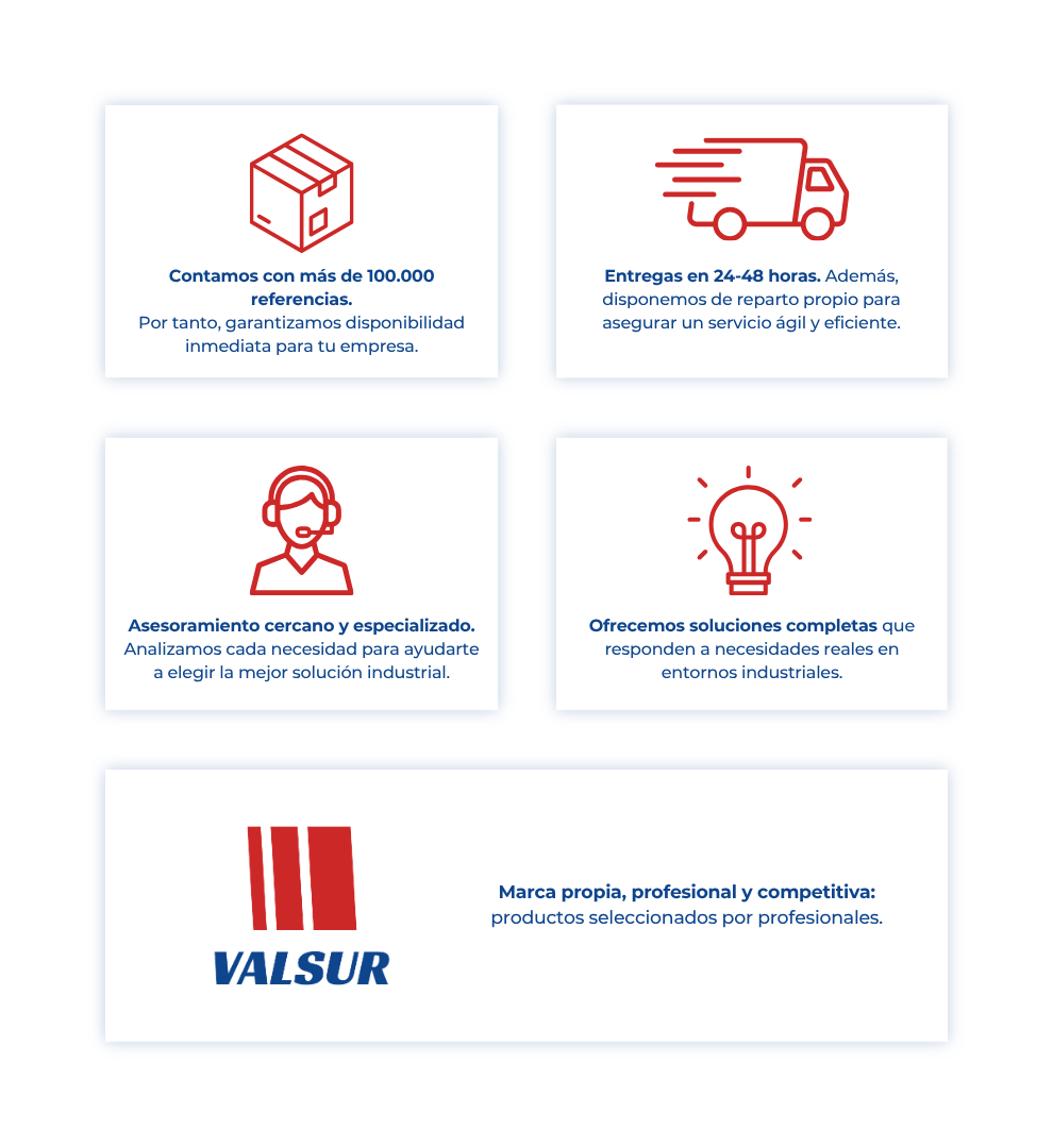 En Grupo Valsur no solo vendemos productos. Somos especialistas en suministros industriales y ofrecemos soluciones pensadas para el día a día de la industria.