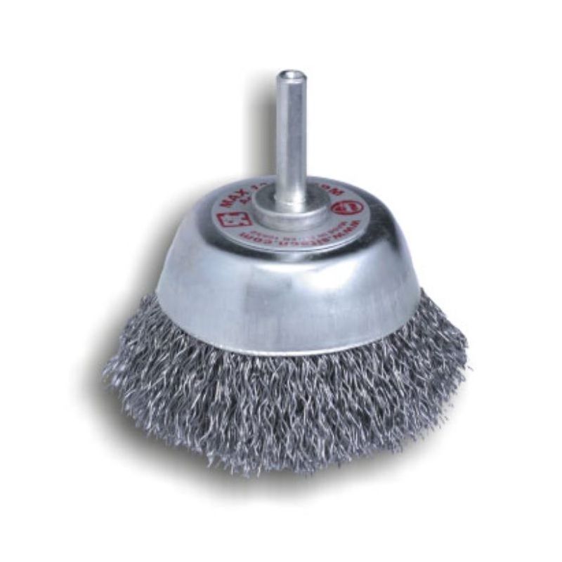 Cepillo de taza con espiga. Ideal para superficies planas, de acero ondulado y alta resistencia con alambres trenzados para mayor agresividad.