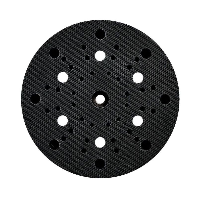 El plato abrasivo de 150 mm Multi-Hole de Metabo es un accesorio diseñado para lijadoras excéntricas, permitiendo un lijado eficiente con una correcta aspiración de polvo.