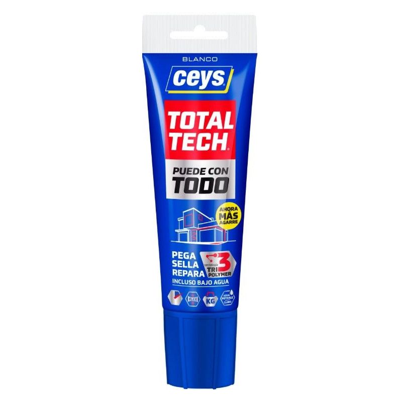 Total◊Tech◊ blanco 125ml de Ceys es un adhesivo sellador híbrido de alta polivalencia, formulado con tecnología Tripolymer para uso industrial y profesional. Diseñado para unir, sellar y reparar en un solo producto, combina la capacidad de adhesión de un adhesivo de montaje con la elasticidad y estanqueidad de un sellador técnico, permitiendo aplicaciones en interior y exterior bajo condiciones exigentes, incluso con exposición a agua, rayos◊UV y temperaturas variables.