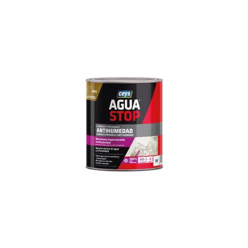 El CEYS Aguastop Antihumedad es una membrana impermeabilizante transpirable diseñada para el tratamiento de paredes y techos afectados por problemas de humedad. El producto crea una barrera impermeable que evita la penetración de agua y bloquea la reaparición de manchas provocadas por filtraciones, condensación o humedad procedente del subsuelo.