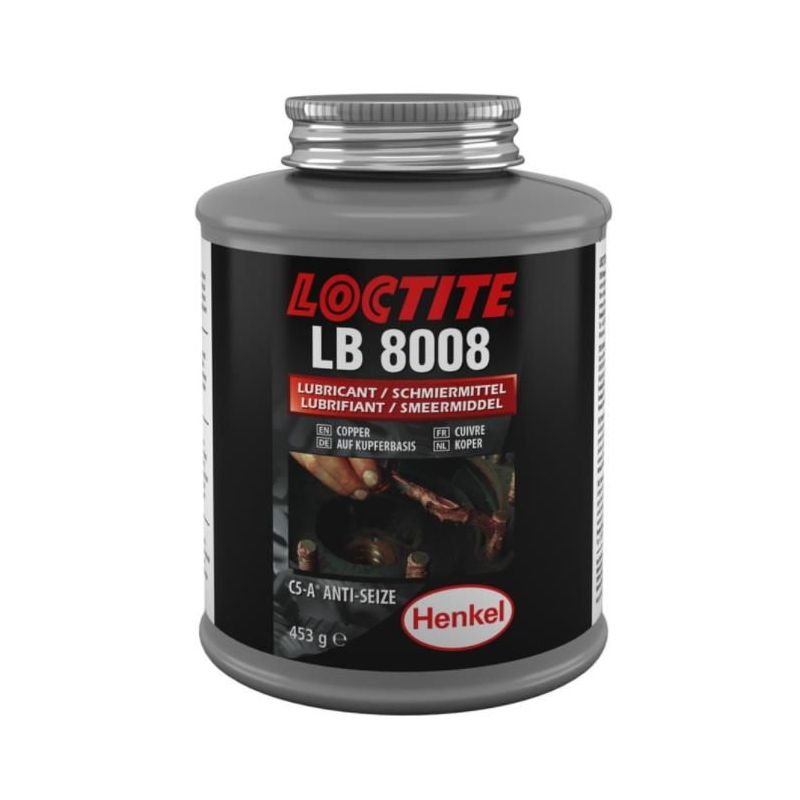 La pasta lubricante antigripante LOCTITE® LB 8008 C5-A se presenta en un bote con aplicador de brocha, con partículas de cobre y de grafito suspendidas en grasa de alta calidad. Algunas de sus aplicaciones son: tornillos, tuercas, tuberías, pernos de escapes y pernos de pinzas de freno. Ofrece una resistencia térmica extremadamente alta (hasta +980 °C) y protege los montajes frente a la oxidación, la corrosión, la soldadura por fricción y el gripado. Su clasificación NLGI es 0.