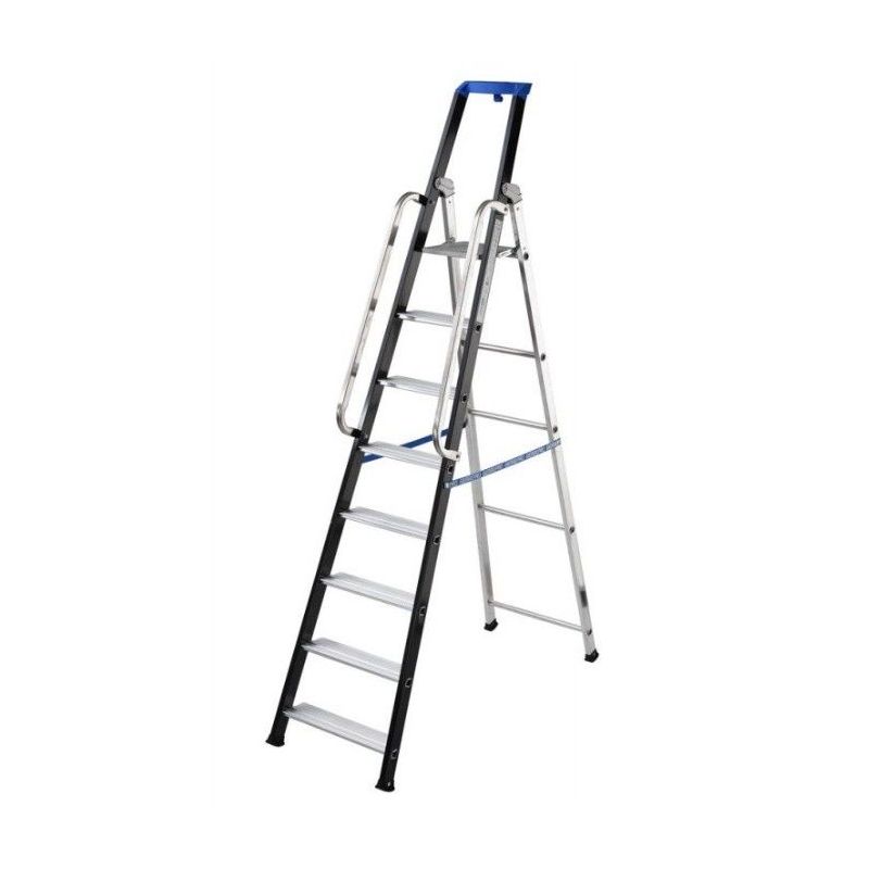 Su plataforma de aluminio estrusionado cuenta con una estructura reforzada, lo que le otorga una firmeza superior, ideal para tareas profesionales. Además, los peldaños tubulares reforzados de 110 mm de ancho aseguran una pisada cómoda y antideslizante, incluso en jornadas prolongadas.