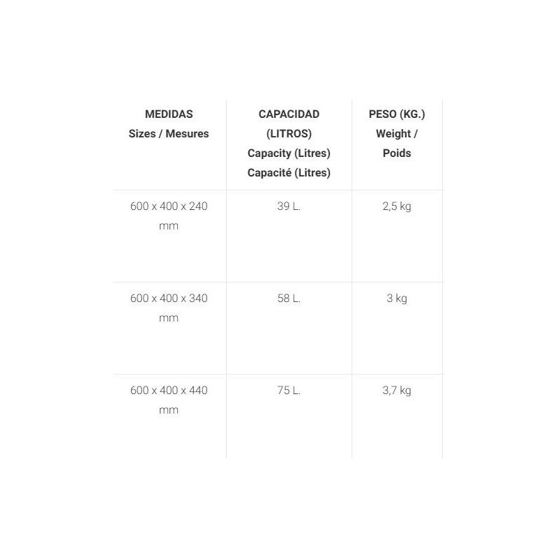 ·Modelo 6424-T: 600x400x240 mm - capacidad 39 L - Peso 2,5 kg