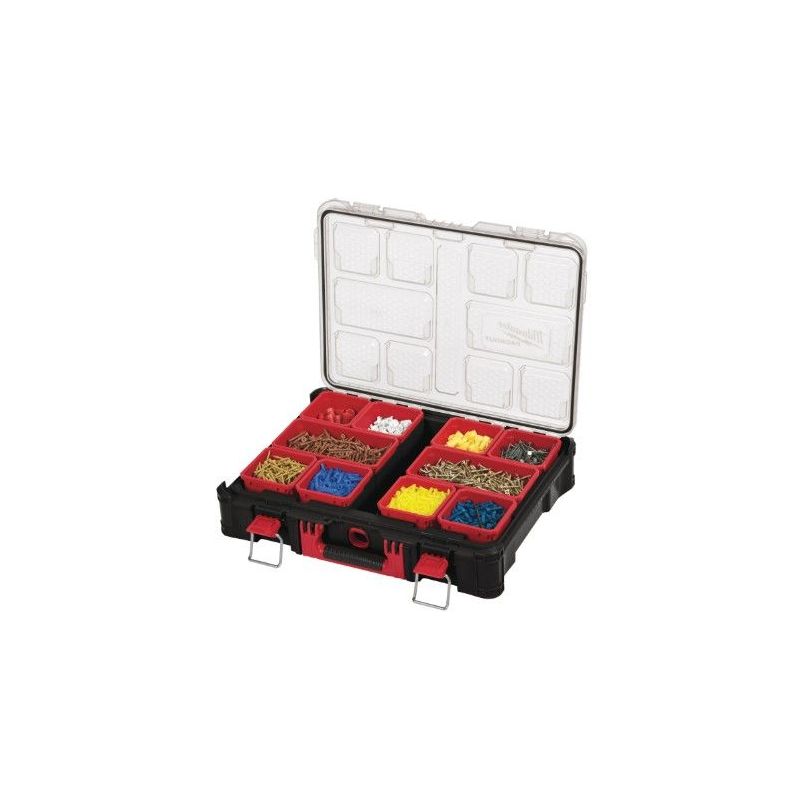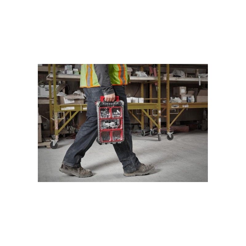 El Organizador PACKOUT 10 Slots de Milwaukee es una solución profesional para el almacenamiento y transporte de tornillería y pequeño material en entornos industriales y de obra. Diseñado para integrarse en el sistema modular PACKOUT, este organizador Milwaukee garantiza orden, protección y acceso rápido al material, incluso en condiciones exigentes. Su construcción robusta y su protección IP65 lo convierten en un maletín porta tornillos fiable para uso intensivo B2B.