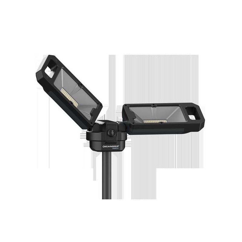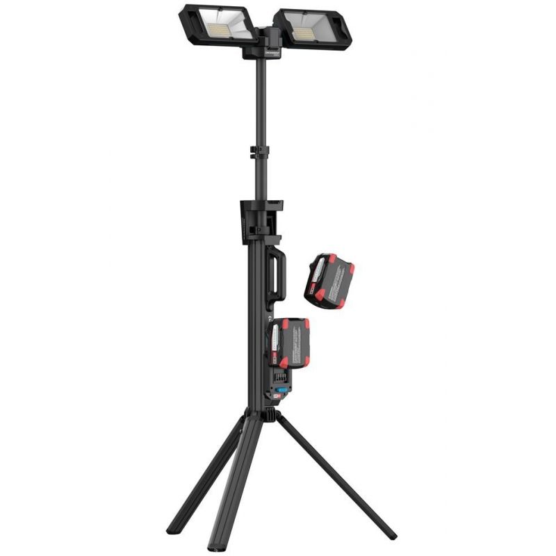 Sistema de iluminación profesional con doble foco LED y trípode telescópico integrado, diseñado para ofrecer una iluminación potente, versátil y eficiente en entornos de trabajo exigentes.
