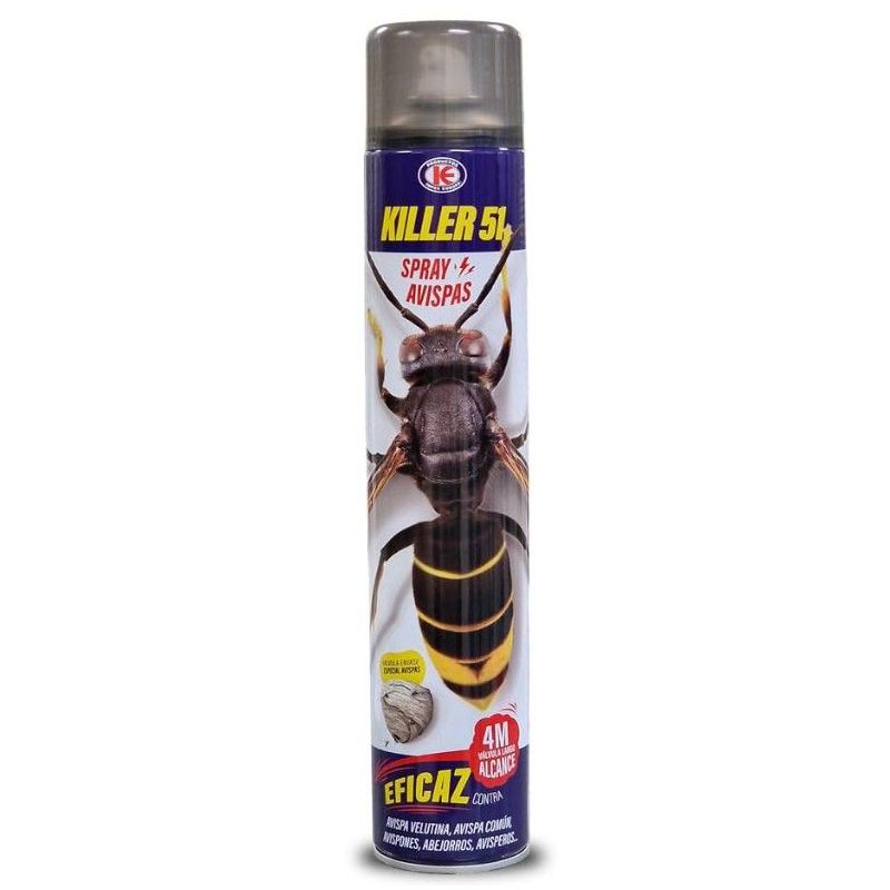 Killer 51 Spray Avispas 750 ml es un insecticida en aerosol formulado para eliminar eficazmente avispas velutinas, avispas comunes, avispones, abejorros y otros insectos voladores. Incorpora una válvula especial que permite un alcance de hasta 4 metros, ideal para actuar con seguridad sobre nidos y zonas elevadas.