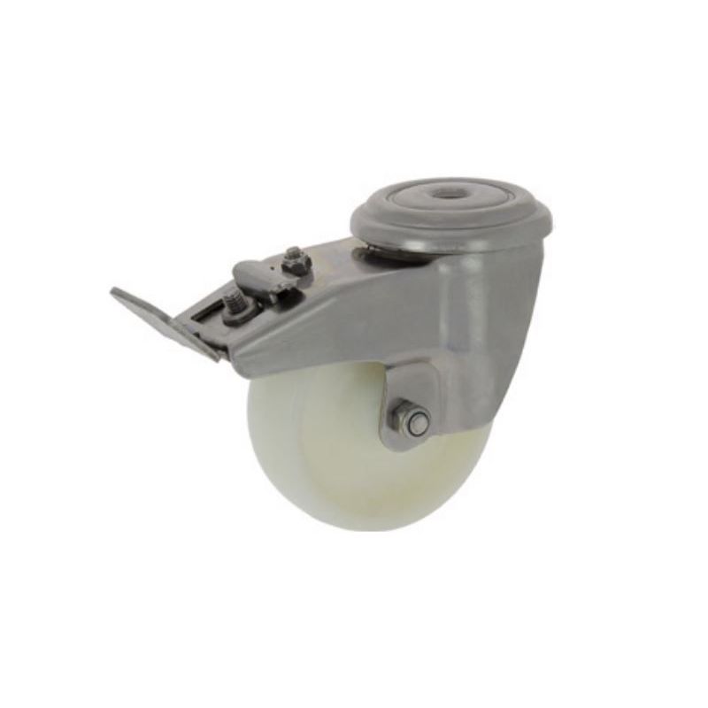 Equipada con soporte en acero inoxidable y rueda de nylon, ofrece una rodadura resistente al desgaste, ideal para cargas elevadas en superficies duras. Incorpora sistema de freno que permite bloquear la rueda, aportando estabilidad y seguridad en equipos y carros durante su uso.