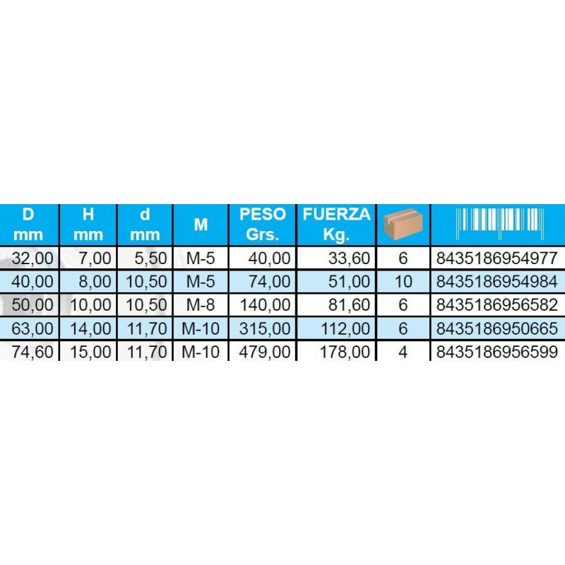 Imán combinación de Neodimio, Hierro y Boro (NdFeB). Actualmente son los imanes más potentes, muy adecuados para aplicaciones que requieren miniaturización. Pueden contar con varios baños de revestimiento, según las condiciones de trabajo que deban soportar: zinc, níquel, resina epoxi, etc.