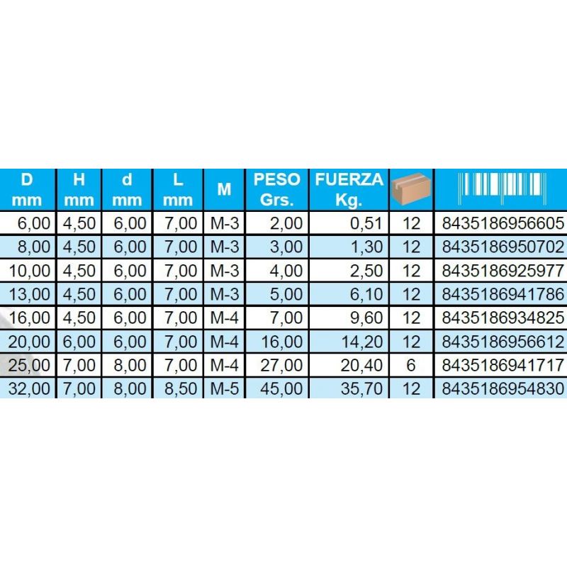 Imán combinación de Neodimio, Hierro y Boro (NdFeB). Actualmente son los imanes más potentes, muy adecuados para aplicaciones que requieren miniaturización. Pueden contar con varios baños de revestimiento, según las condiciones de trabajo que deban soportar: zinc, níquel, resina epoxi, etc.