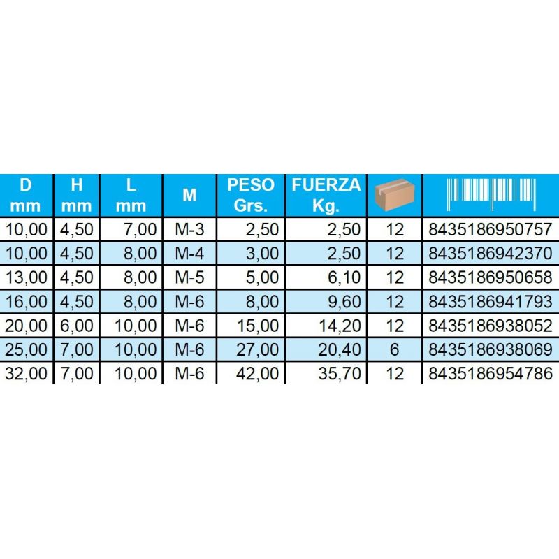 Imán combinación de Neodimio, Hierro y Boro (NdFeB). Actualmente son los imanes más potentes, muy adecuados para aplicaciones que requieren miniaturización. Pueden contar con varios baños de revestimiento, según las condiciones de trabajo que deban soportar: zinc, níquel, resina epoxi, etc.