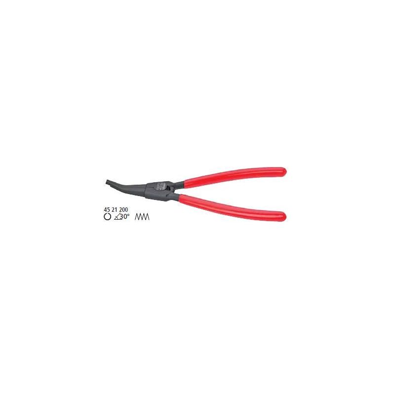Herramienta especializada para el montaje de arandelas de retención en ejes, con mordazas en ángulo de 30° y boca angulada con agujero central. Ideal para arandelas de retención estándar a partir de Ø 12 mm, por ejemplo, en el aseguramiento del árbol articulado de un reductor de automóvil.