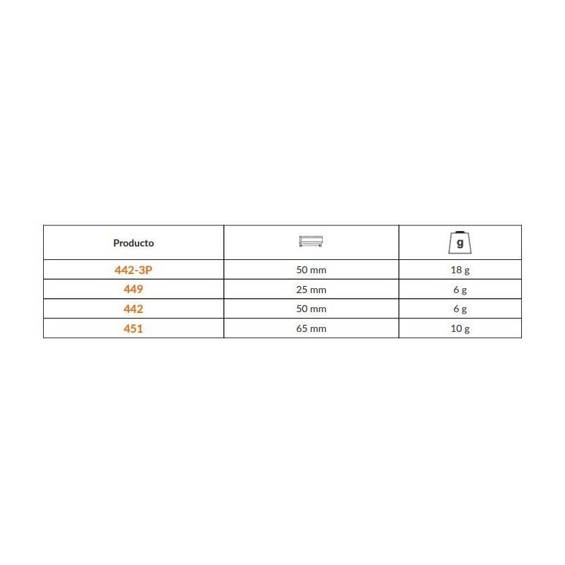 • 442: doble filo de 50 mm; 451: doble filo de 65 mm; 449: triangular de 25 mm