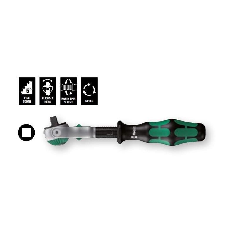 La Carraca Zyklop 1/4" Wera 8000 A es una herramienta ágil y precisa, diseñada para facilitar el trabajo en espacios reducidos. Su mecanismo de 72 dientes proporciona un 'e1ngulo de retorno de tan solo 5°, mientras que su cabeza pivotante y bloqueable permite adaptarse a cualquier ángulo de trabajo. Además, puede utilizarse como destornillador gracias a su posición fija a 0° y a su mango ergonómico con diseño giratorio.