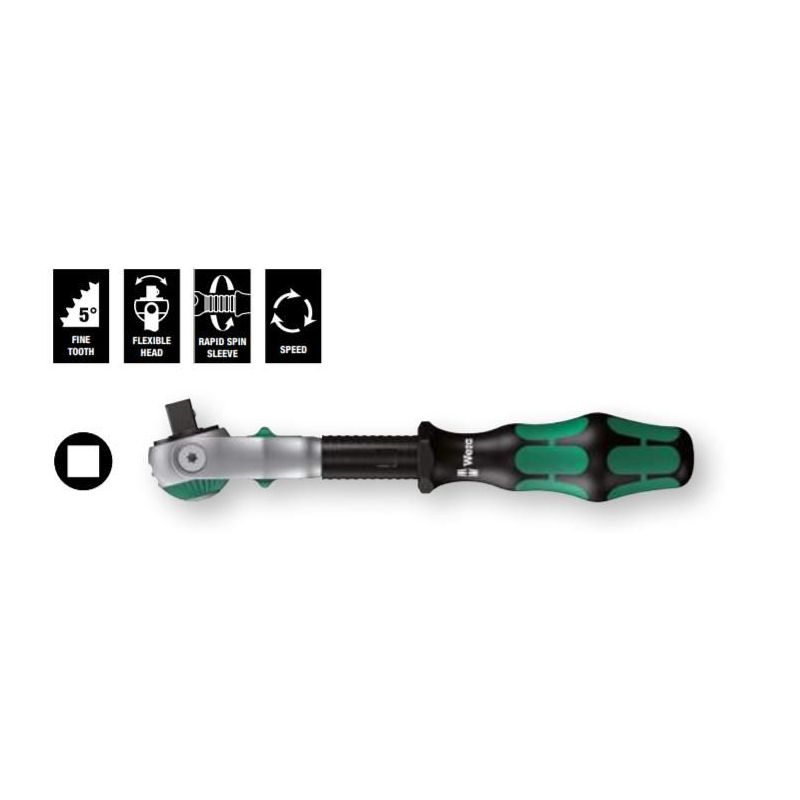 La Zyklop 8000 B de Wera es una carraca versátil con diseño ergonómico y máxima funcionalidad. Su cabeza giratoria, dentado fino y diseño compacto la hacen perfecta para trabajar con comodidad incluso en los espacios más estrechos.