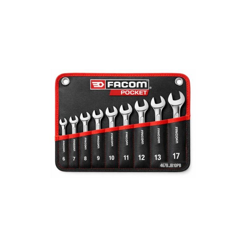El juego de 10 llaves fijas FACOM Pocket es una solución profesional diseñada para trabajos de apriete y aflojado de tornillería métrica en mantenimiento industrial, montaje mecánico y servicio técnico. Su formato compacto tipo “Pocket” facilita el transporte y almacenamiento, siendo especialmente adecuado para técnicos que necesitan movilidad en planta o intervenciones en campo.