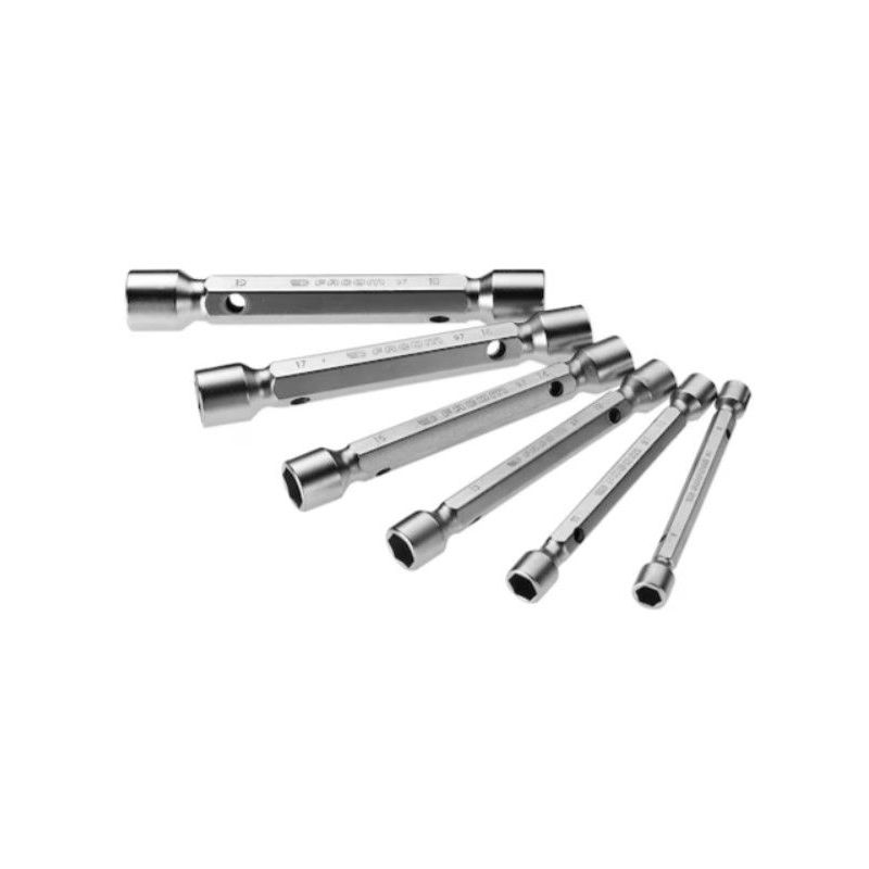 El juego de llaves de tubo doble FACOM serie 97 de 6 piezas está diseñado para el apriete y aflojado de tornillería hexagonal en mantenimiento industrial, montaje mecánico y mecánica general. Cada llave dispone de doble extremo con perfil 6 caras, ofreciendo mayor superficie de contacto y reduciendo el riesgo de redondeo de la tuerca.
