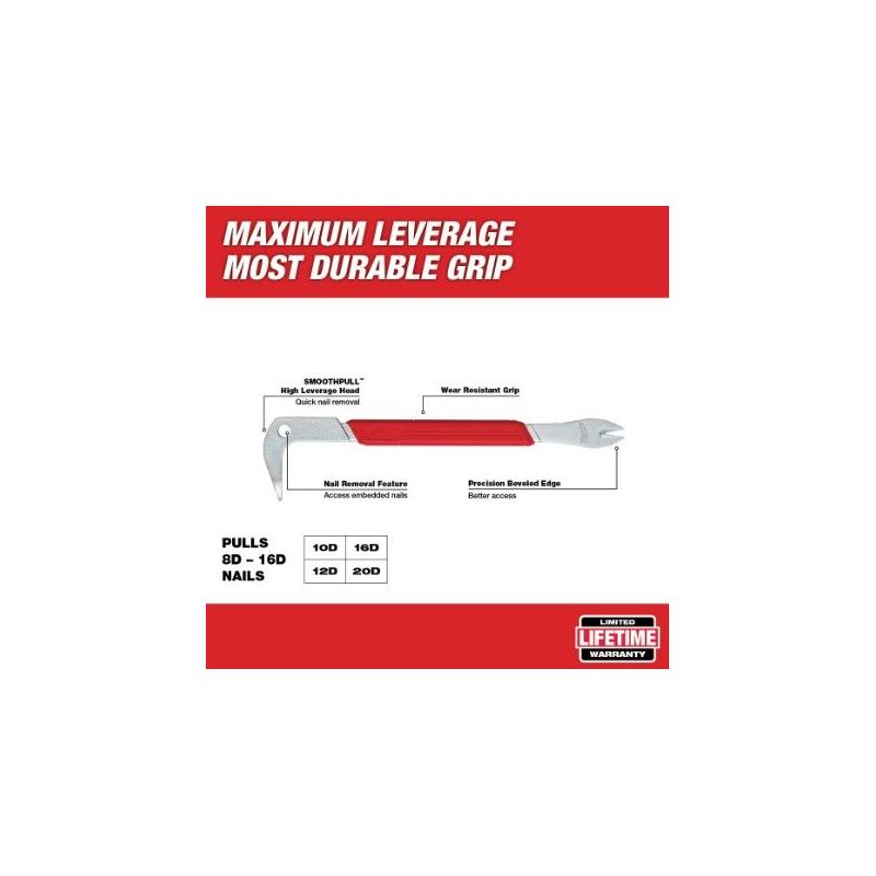 La Palanca Sacaclavos Milwaukee es una herramienta profesional diseñada para retirar clavos de manera rápida y eficiente, minimizando los daños en las superficies de trabajo. Gracias a su uña de bajo perfil y a su empuñadura ergonómica que reduce la vibración, esta palanca permite acceder incluso a los clavos más difíciles, optimizando el trabajo en carpintería, construcción y mantenimiento industrial. Ideal para cualquier profesional que busque un sacaclavos resistente y duradero.