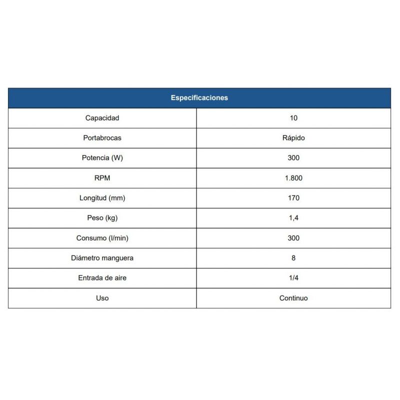 ·Consumo Eficiente: Requiere un consumo de aire de 300 l/min para un funcionamiento eficiente y económico.