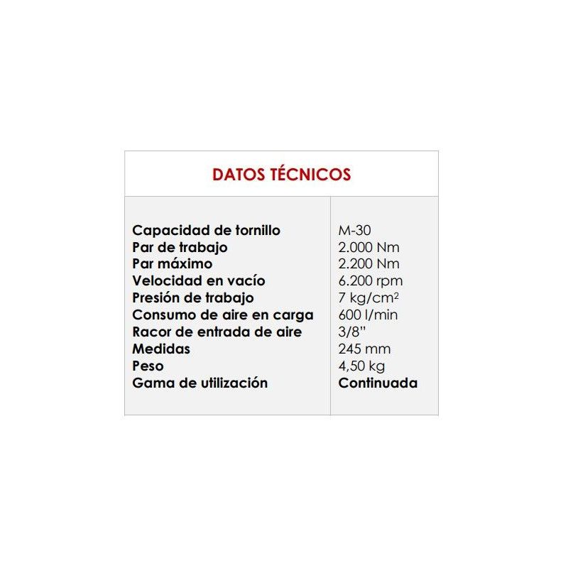Llave de impacto neumática profesional de 3/4 diseñada para un uso continuado en entornos industriales. Ofrece un alto rendimiento con un par máximo de 2200 Nm y capacidad para tornillos hasta M30.