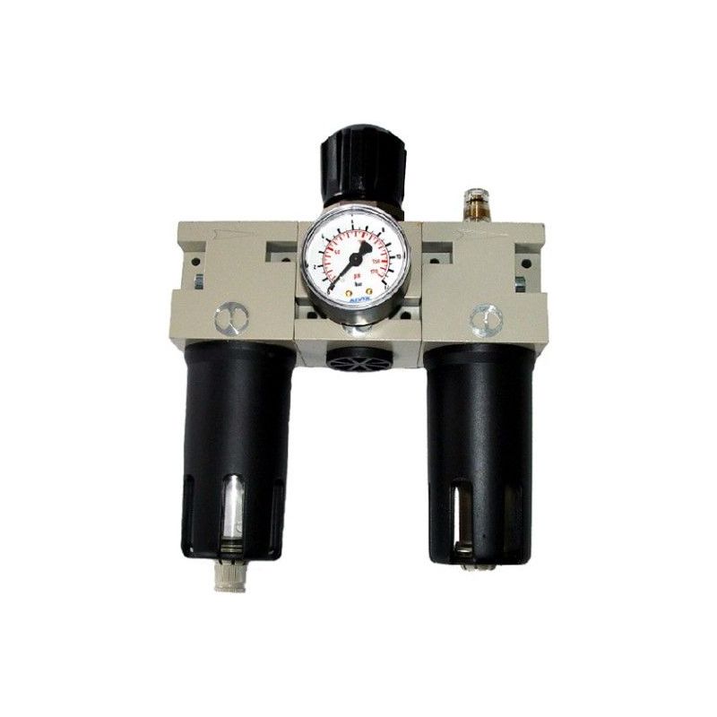 Este conjunto es habitual en líneas de aire comprimido que alimentan pistolas, llaves de impacto, grapadoras y otras herramientas neumáticas, proporcionando un control preciso de la presión de trabajo gracias al manómetro integrado y permitiendo la incorporación de lubricación al sistema cuando sea requerido.