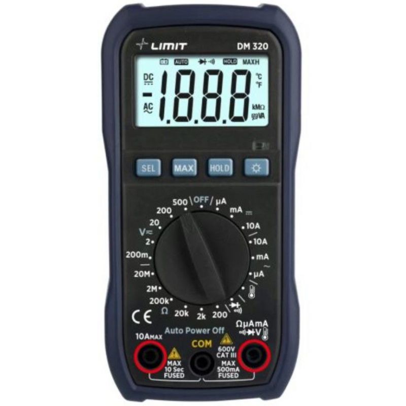 El Multímetro Electrónico Limit DM 320 es la herramienta ideal para mediciones precisas de voltaje, corriente, resistencia y temperatura en entornos industriales y eléctricos. Diseñado para ofrecer fiabilidad y facilidad de uso, incorpora funciones avanzadas como prueba de diodos, prueba de continuidad con zumbador y registro de datos. Su pantalla retroiluminada y su diseño compacto lo convierten en un instrumento esencial para técnicos y profesionales.