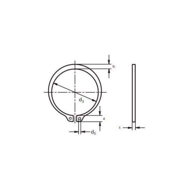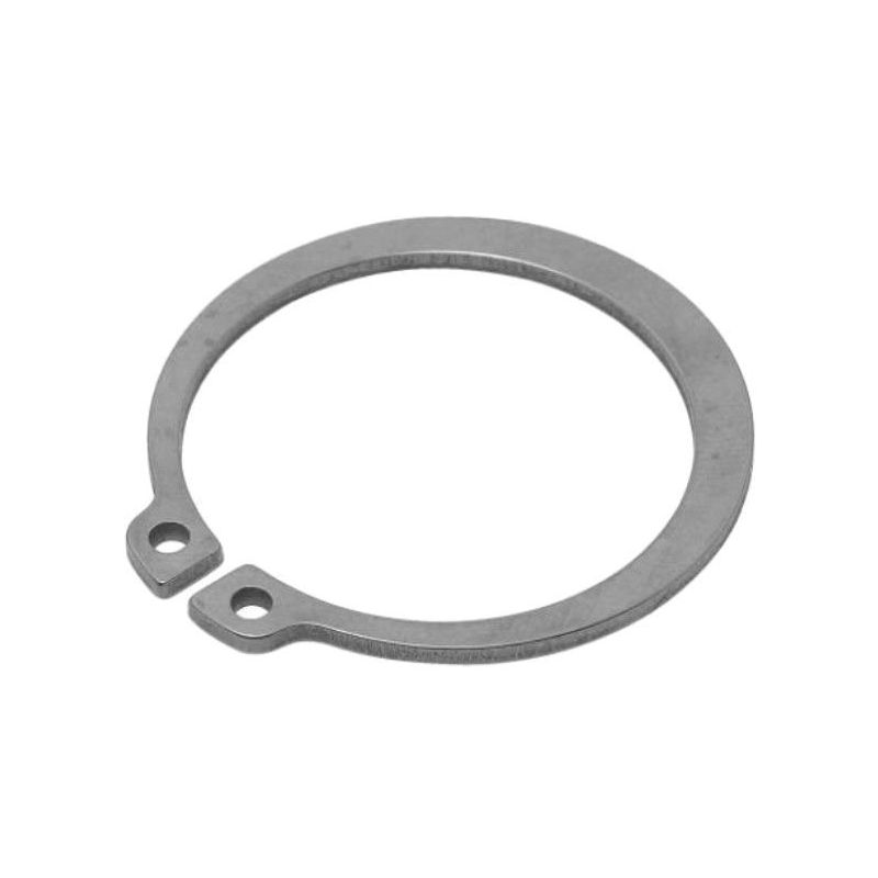 El anillo externo para ejes DIN 471 es un elemento de seguridad utilizado universalmente para montaje axial en una ranura externa. Sujeta elementos a ejes; como por ejemplo una rueda libre, una pieza cualquiera, una palanca, etc. Puede transmitir cargas axiales considerables entre el elemento de la máquina que ejerce la fuerza y la ranura sobre la cual va montado el anillo.