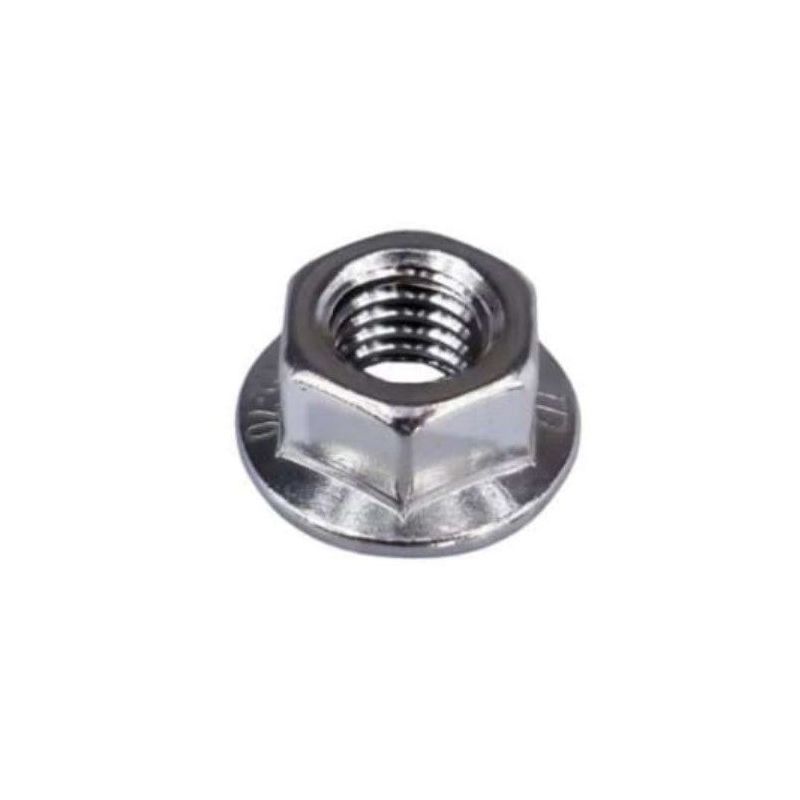 Tuerca hexagonal con brida grafilada (base no lisa). La brida realiza la función de arandela.