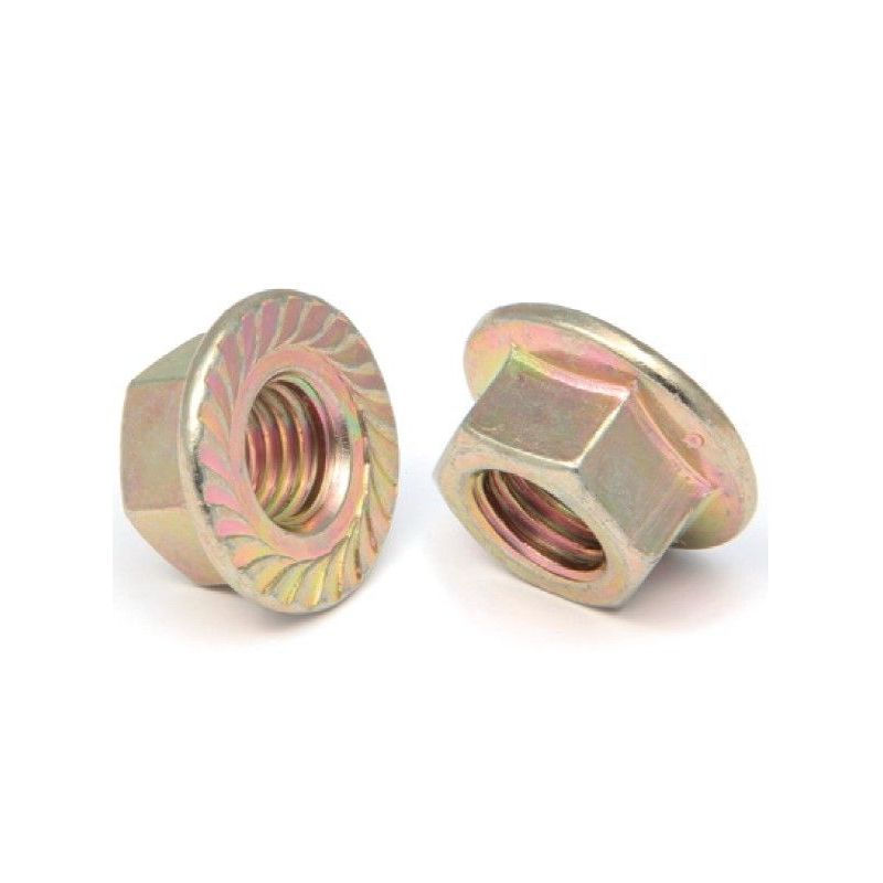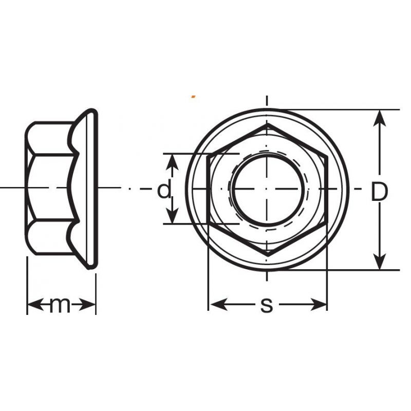 Tuerca hexagonal con brida grafilada (base no lisa). La brida realiza la función de arandela.
