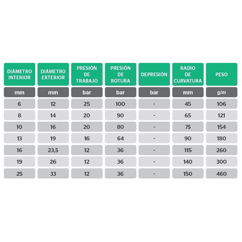 ·Refuerzo Textil Sintético: Incorpora un refuerzo textil sintético que fortalece la estructura de la manguera, proporcionando resistencia adicional y asegurando una larga vida útil.