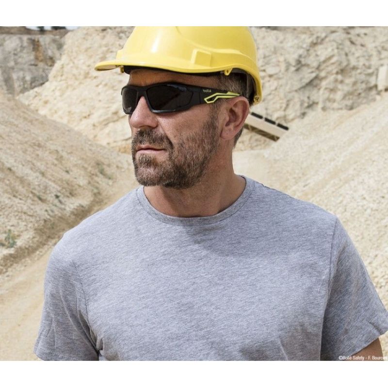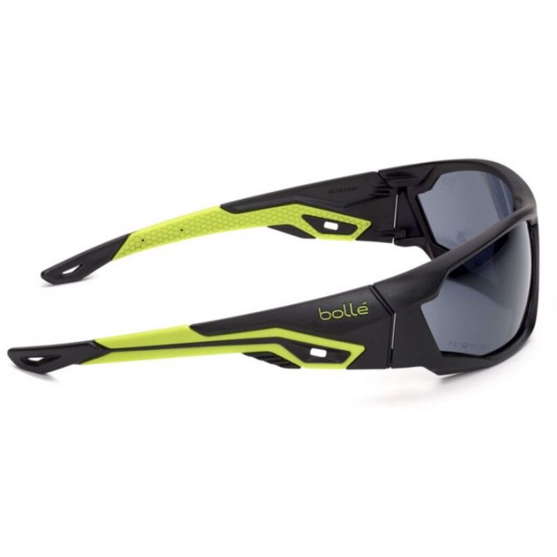 Gafas de protección Mercuro de Bollé con montura PC y patilla PC TPR. PC ahumado oscuro antirayaduras y antivaho platinum para uso exterior. Además cuenta con la máxima protección contra la radiación solar.