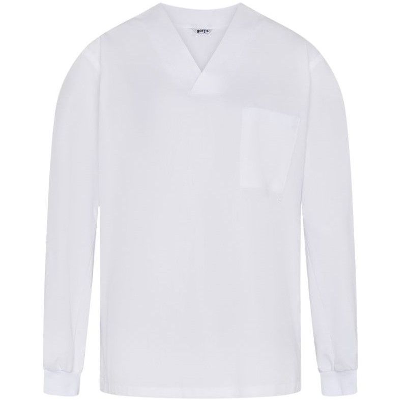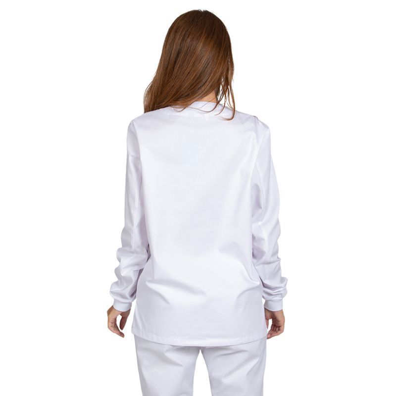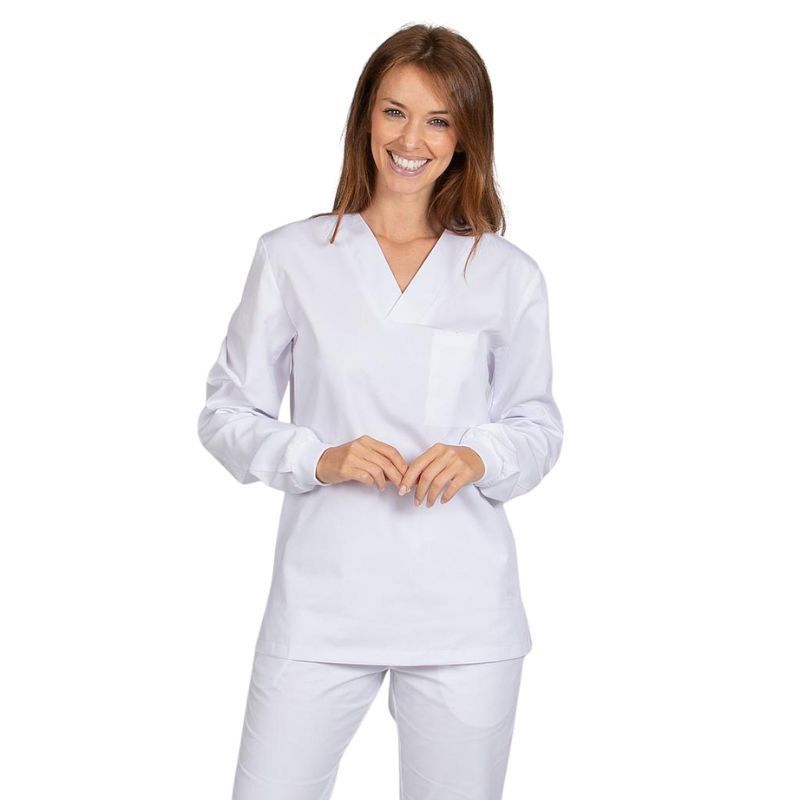 El bolsillo oculto en el pecho permite guardar objetos personales o de trabajo de forma discreta, y las aberturas laterales proporcionan un mejor ajuste al cuerpo. Con un largo aproximado de 74 cm, esta blusa de trabajo combina practicidad, durabilidad y una imagen limpia y profesional.