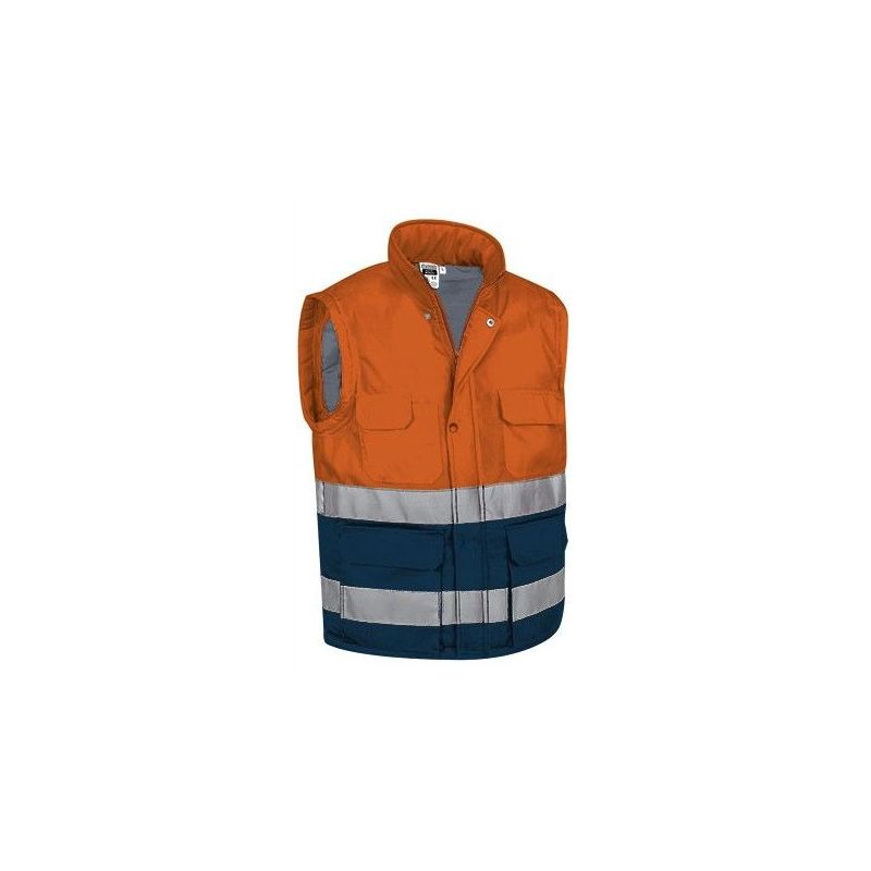 Chaleco acolchado multibolsillos de alta visibilidad, diseñado para trabajos en exteriores y entornos industriales con riesgo de baja visibilidad. El chaleco Valento Bergen combina tejido sarga resistente con relleno térmico y cintas retro-reflectantes cosidas en torso y espalda. Certificado como EPI de Categoría II según normas EN ISO 13688 y EN ISO 20471 clase 1, con duración máxima de 25 lavados. Incluye múltiples bolsillos funcionales, cuello alto, cierre frontal con cremallera, tapeta y corchetes, además de faldón trasero para protección lumbar.
