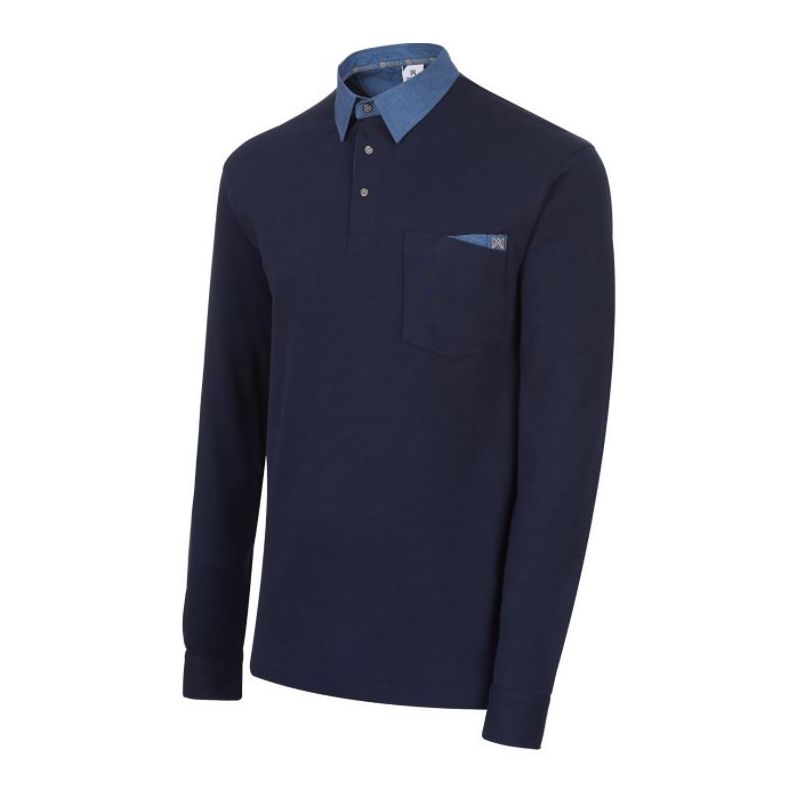 Polo de manga larga, con cuello camisero en tejido denim y abertura central con corchetes. Con espalda más larga en la zona lumbar para que esta quede protegida. Aberturas laterales para mayor comodidad. Puño camisero cerrado con corchetes. Bolsillo en el pecho con compartimento para bolígrafo.